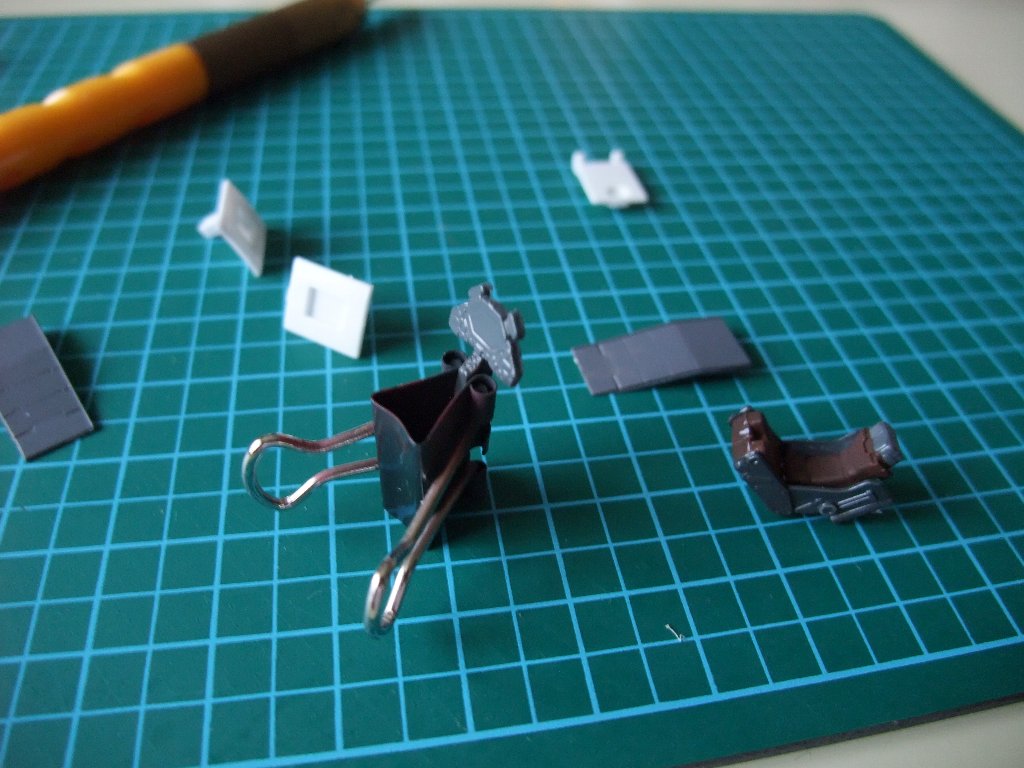 | 細かいパーツを塗っていきます。コクピットはニュートラルグレーで適当に。 | |