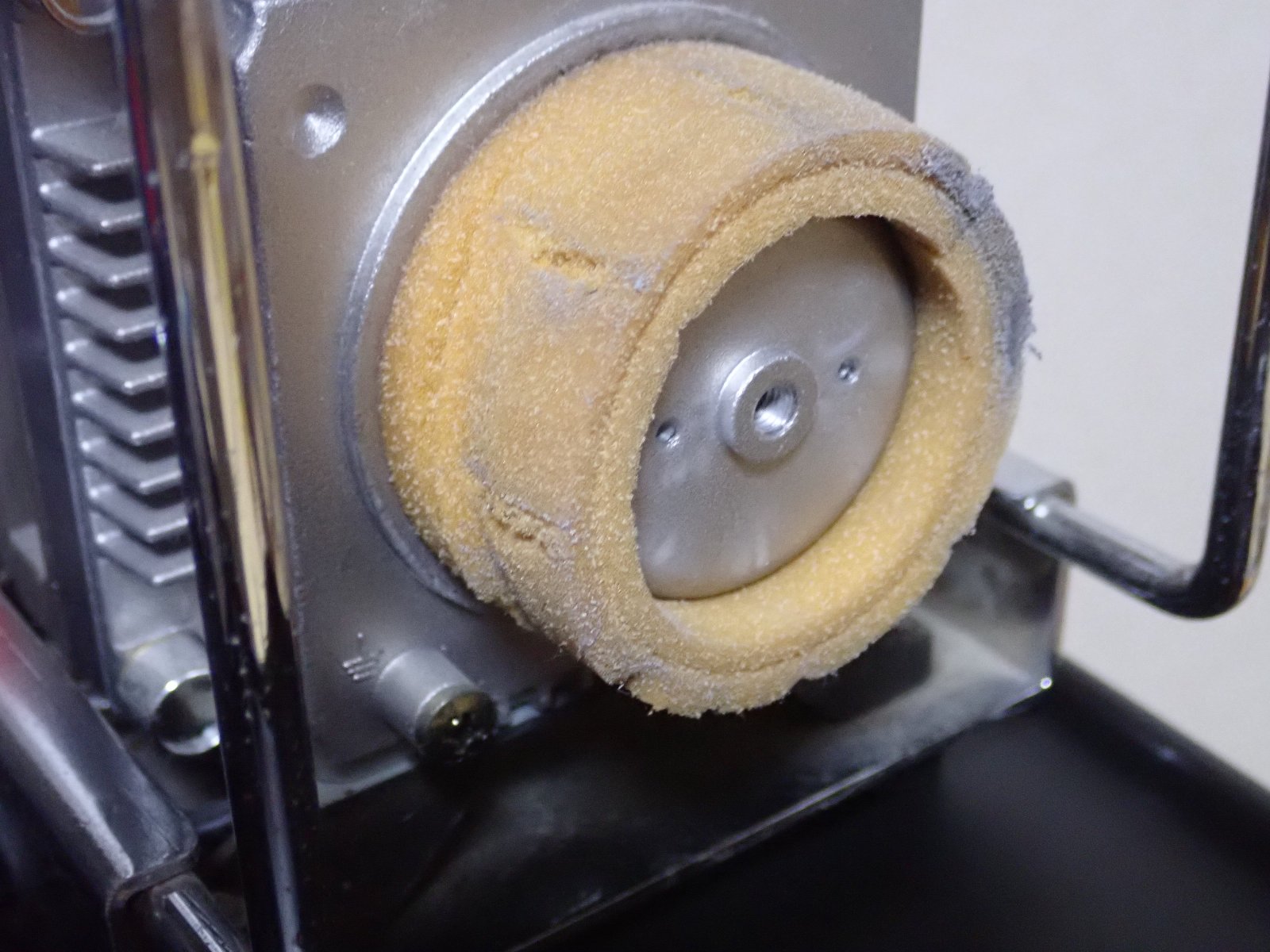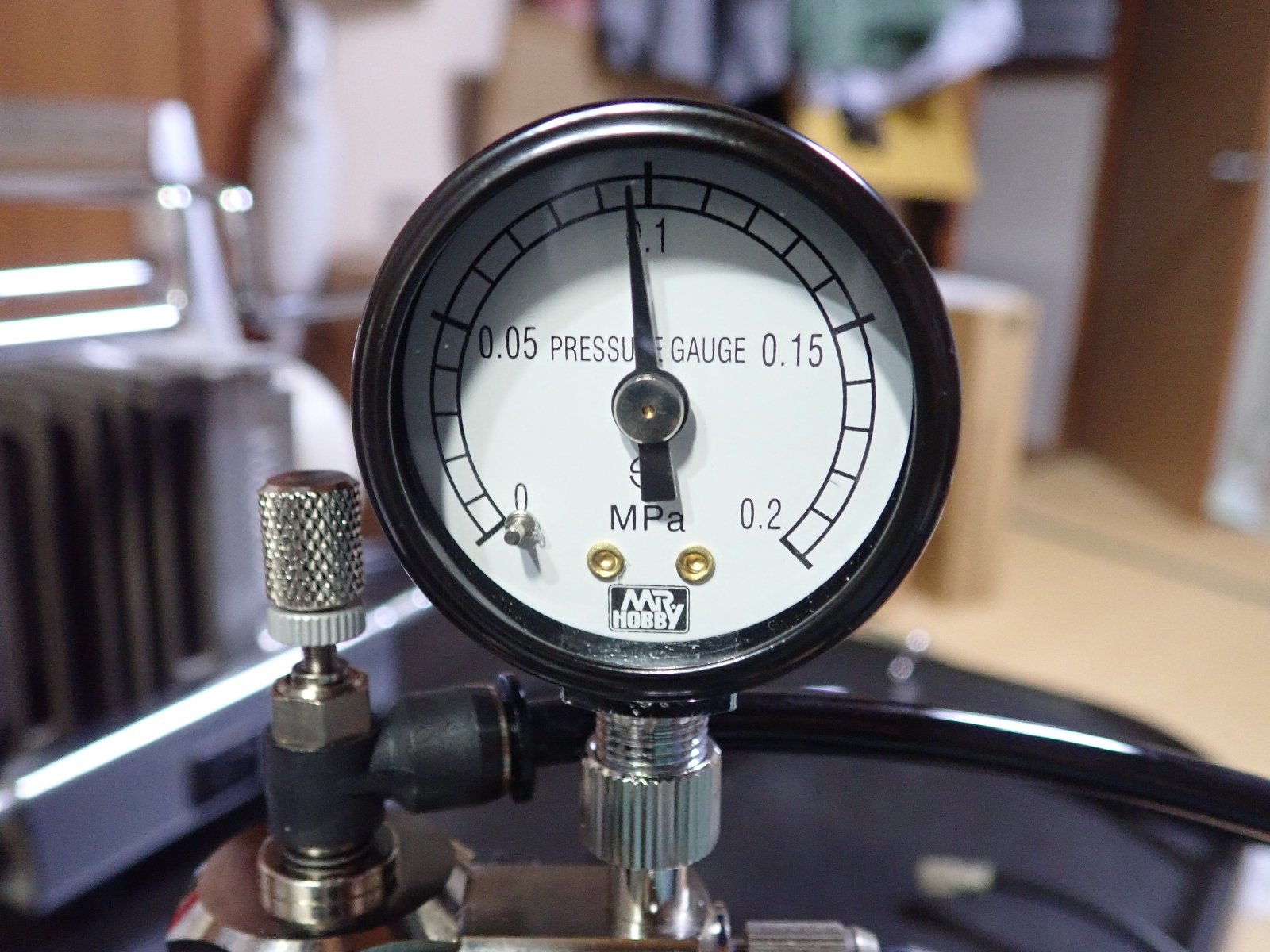 レギュレーターを入手したので、メーターで確認しました。パッと付けて確認しましたが、アイドル時(電源を入れた直後)は0.15MPaを差し、吹いている最中は0.09MPaくらい出てますね。L5の公称性能と同じです。これってもの凄くないですか?22年前に購入した機械が、今もなんのメンテナンスをしていなくてこの性能を出せることに驚きました。自動車などなら絶対無理ですよね。クレオスの技術力凄いなぁと改めて思いましたよ。