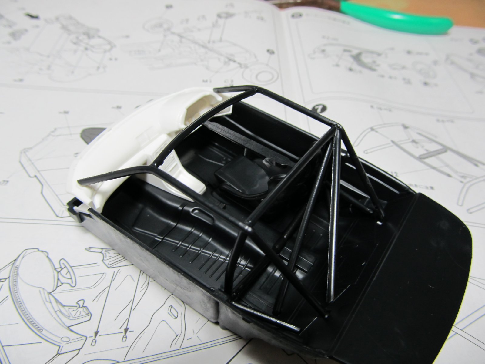 乾燥中に内装も作っていきます。今回はロールバー式の内装にシートを2脚置きました。サイドや4点などは見なかったことにします。