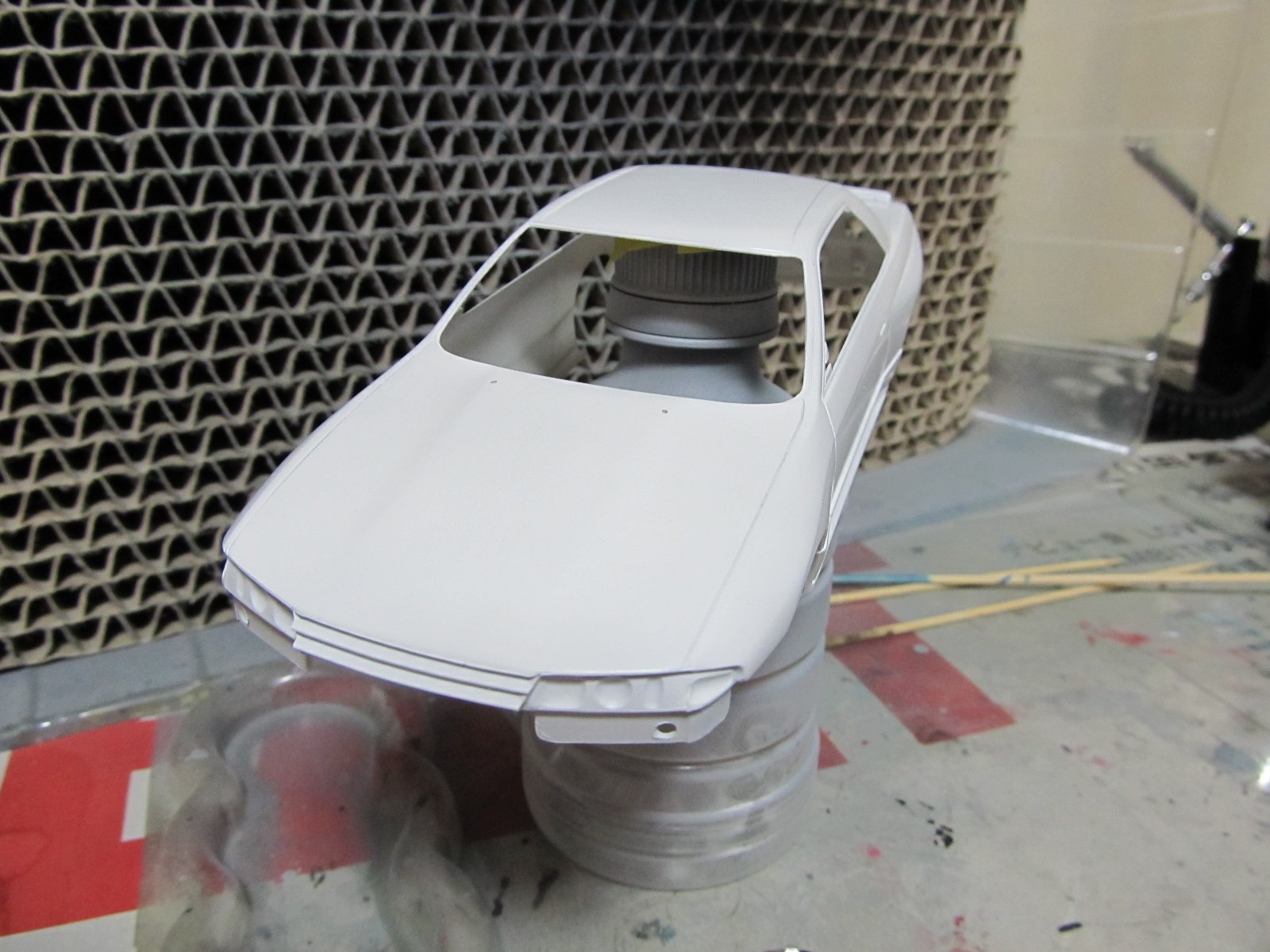 ボディ全体を整形した後に、サフを吹いて、さらにその後にクールホワイトを吹いてあげます。白い車ってすぐにおもちゃっぽくなって難しいですよね。