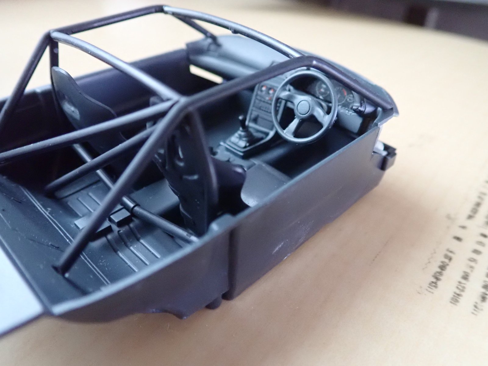 このキットは、内装がノーマルとロールバー式の2パターンの選択式です。当然、れいなのRなのでロールバーを選択しますが、完全にGr.A仕様になりますね(笑)。サイドブレーキさえなくなるとは...