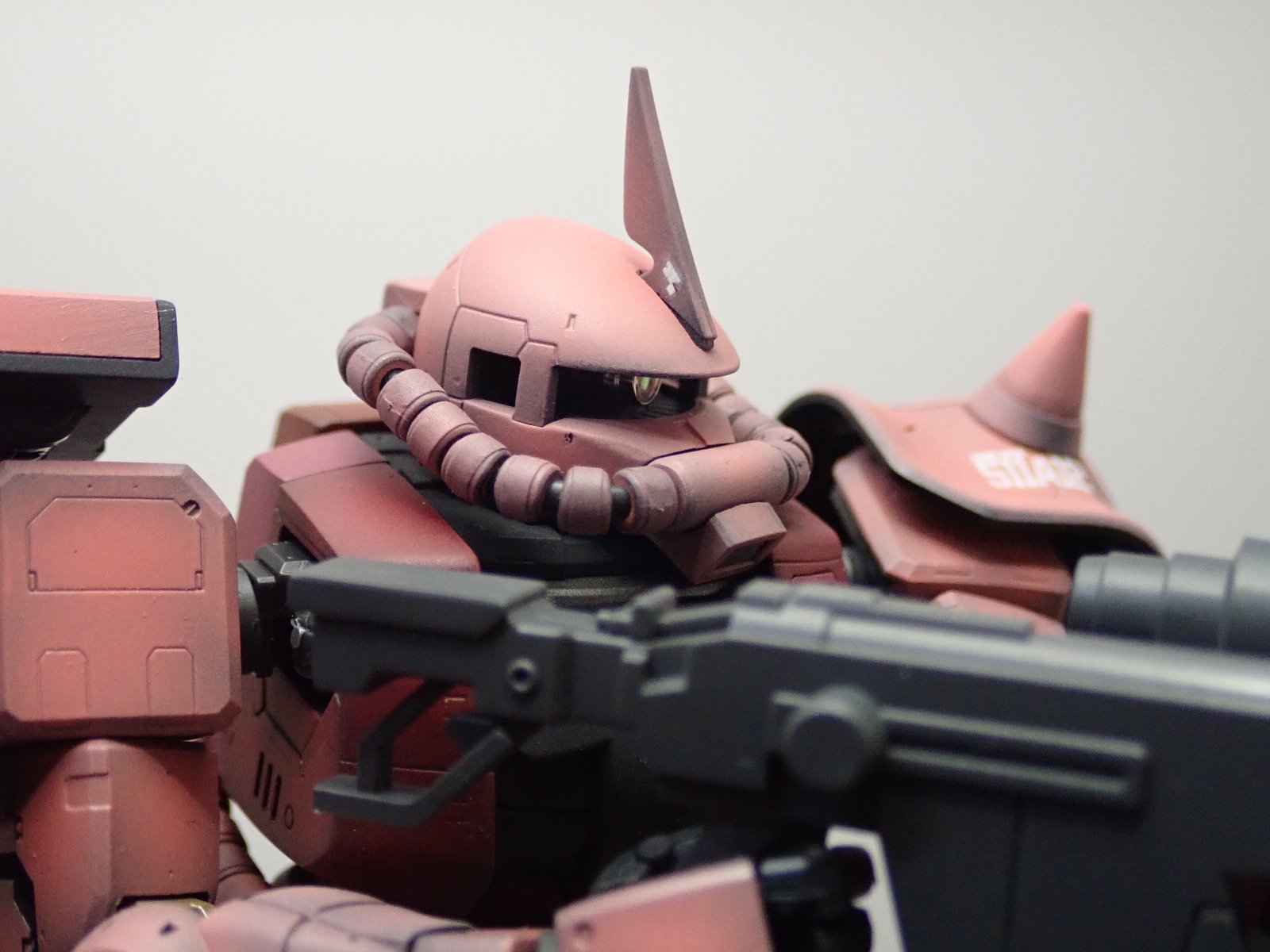 塗装しています。黒サフの後に各塗料を吹いて、ガンダムデカールからシャアのパーソナルマークを中心に貼りました。その後スムースクリアー(つや消し)でコートしています。