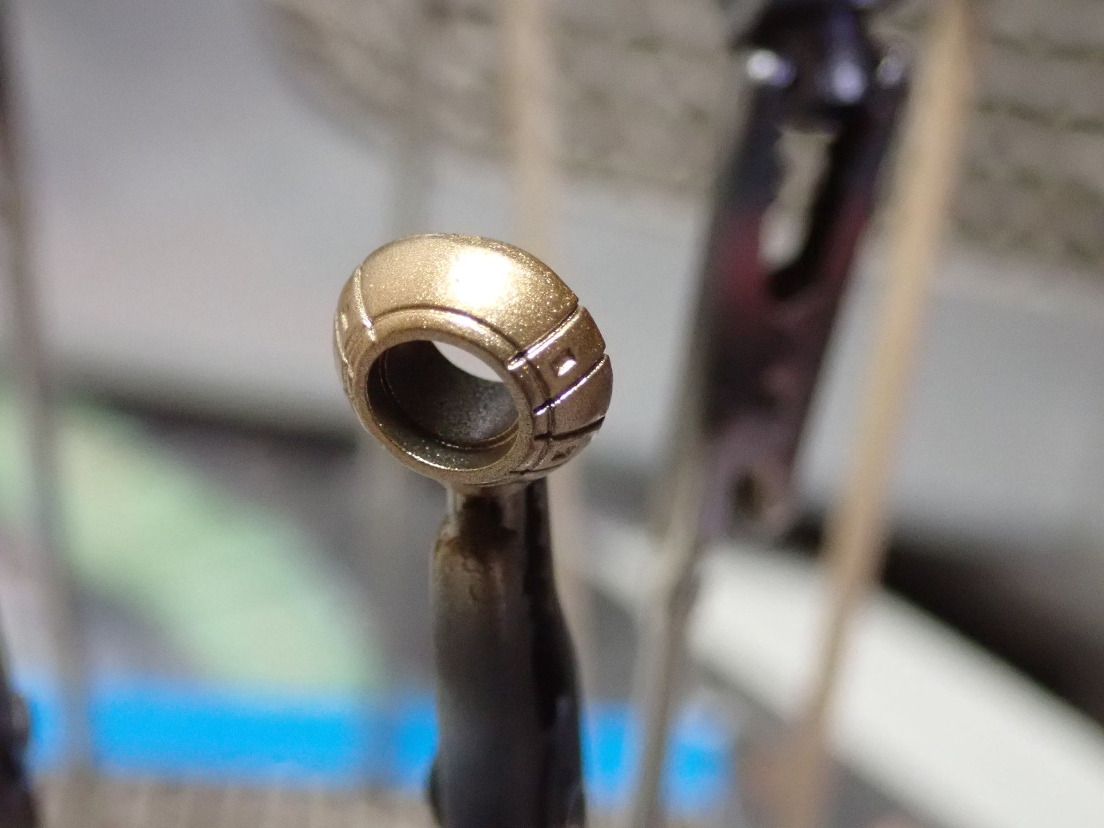 次もベースカラーの上から、今度はゴールドを塗ってみました。思っていたより綺麗なゴールドですね。塗装も圧力高めにして塗料を絞り気味に吹くと綺麗に色が載るし、詰まることもありませんでした。意外とすごいじゃん、アクリジョン。ただし、特にラッカーで普段塗装している人は、1つは希釈度合いが判りにくい。コレは今までの経験を捨てて覚えなおすしかないですよね。ただ、ラッカーのように「ま、いっか」という感覚だと厳しいかも。特に薄めすぎてしまう傾向にありますね。もう1つは隠ぺい力が無さすぎ。ベースカラーのおかげで発色はきれいですが、それでも2、3回塗り重ねます。特に1回目は塗料が流れて行ってしまいそうなくらい薄いので全然色が載りません。ちょっとした部品を塗るのにこの待ち時間は結構苦痛でしたね。においも無いし便利ですが、ラッカー使いの人ほど「面倒」と感じる手順が有ります。ただ、ABSの下地としては良いのではないのでしょうか?
