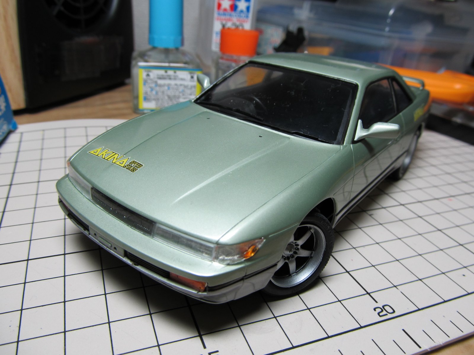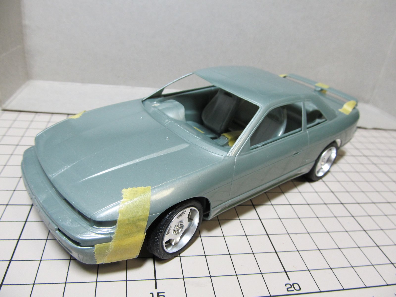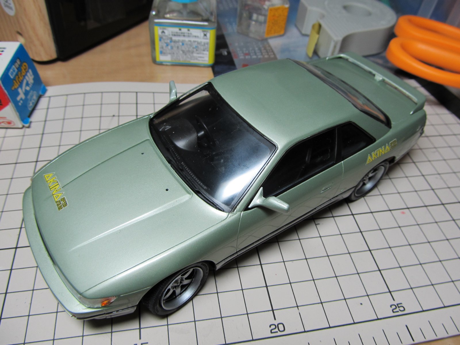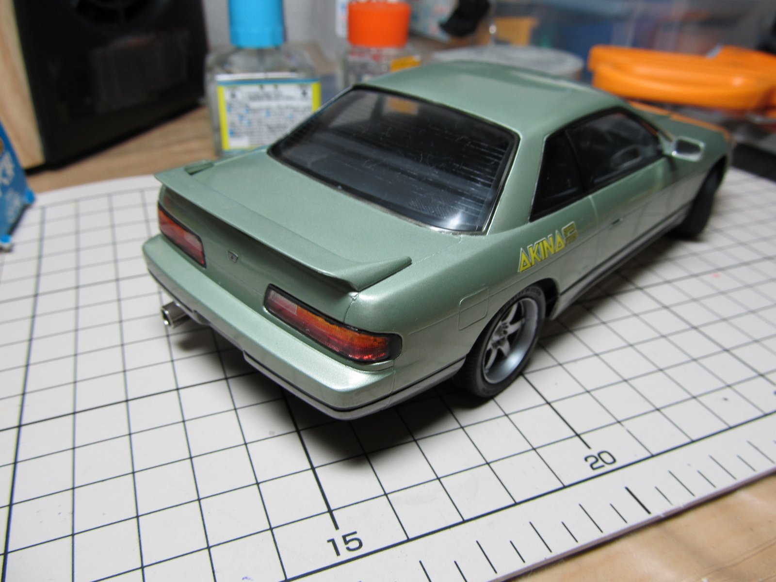 | ほぼ完成です。あとは、ナンバープレートを付けるだけです。改めてみると懐かしいS13ですね。キット自体のつくりはおおざっぱですが、出来上がるとS13っぽさが出ますね。 | |