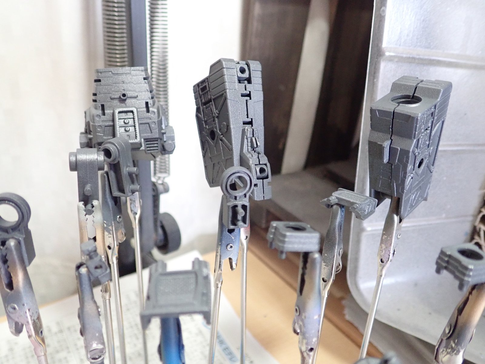 ABSの部品にはアクリジョンベースのグレーを吹きました。本当にアクリジョンベースは使いやすいですね。特に匂いがほぼしないので夜とかにちょっと吹いておくことができるのが利点です。ほぼ水性サフ化しています。まぁ、アクリジョン自体はコツが必要ですけど。