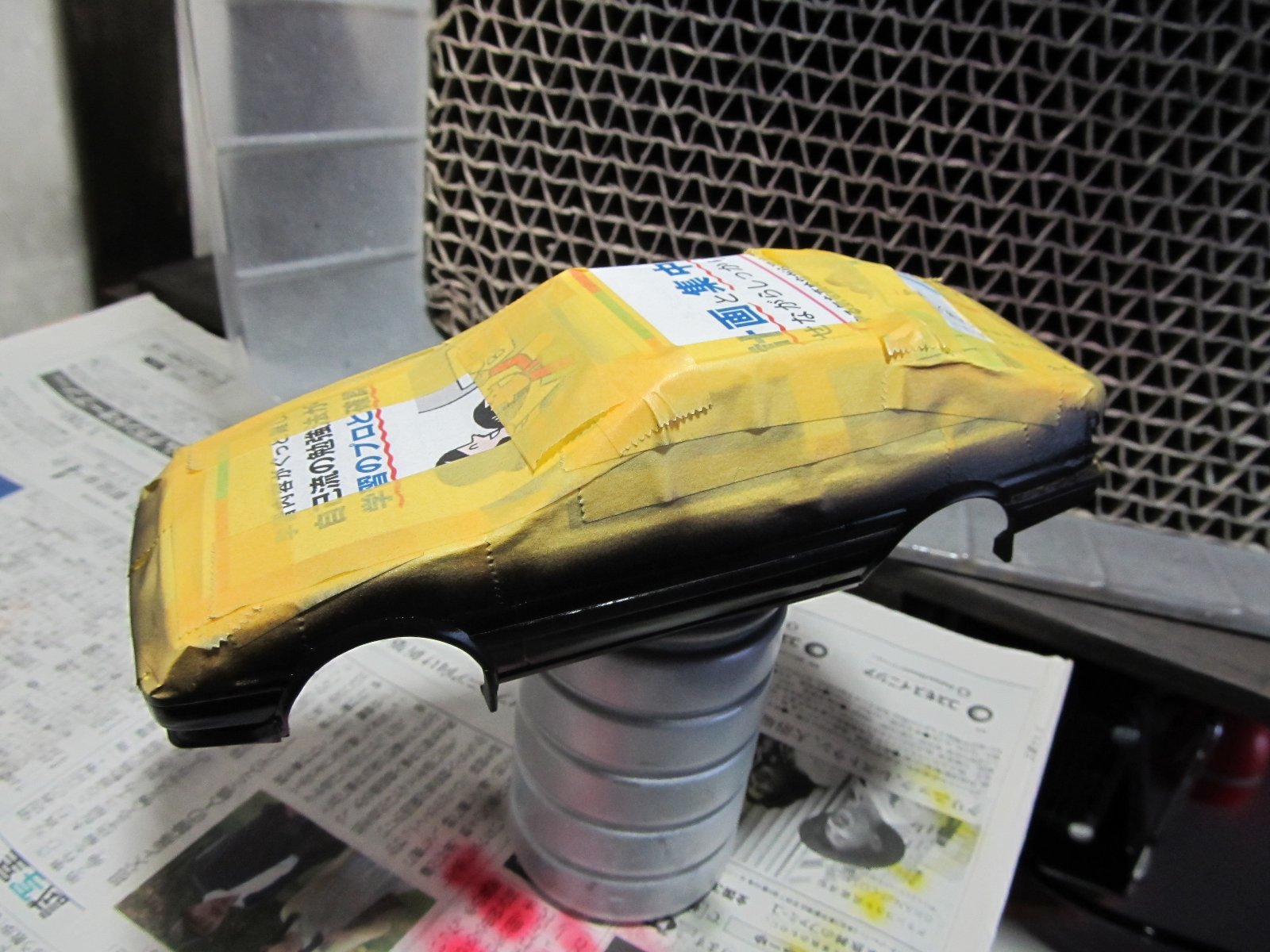 マスキングをして、黒部分の塗装をします。説明書が嘘が多くて塗り分けが分からないので、実車を見ながら塗り分けしました。