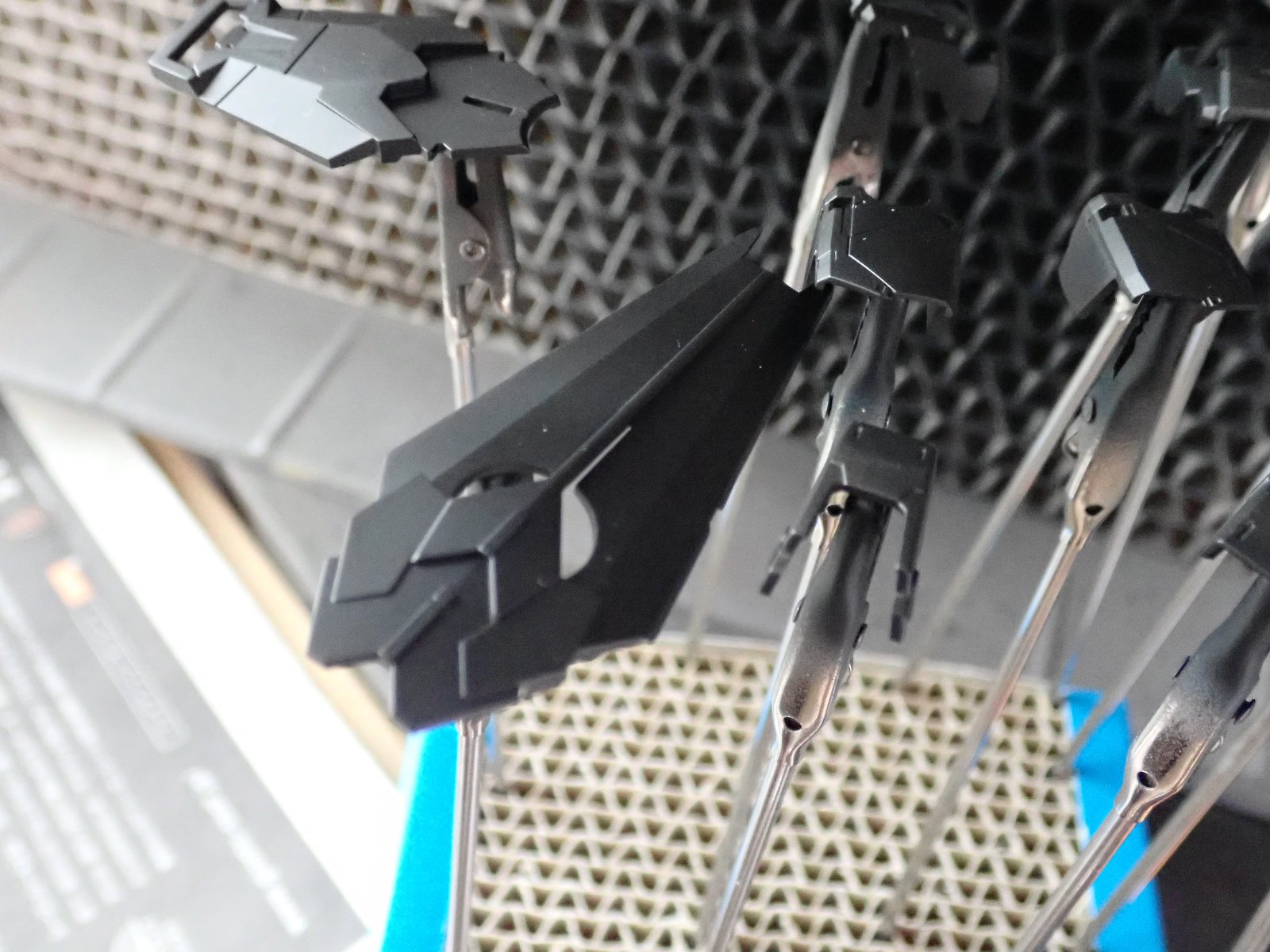 次にベースカラーの上にアクリジョンのジャーマングレーを塗っていきました。ラッカーよりも黒に近い感じですね。これも塗料1:薄め液0.9くらいで塗っています。ベースグレーほどのつや消しにはなりませんね。
