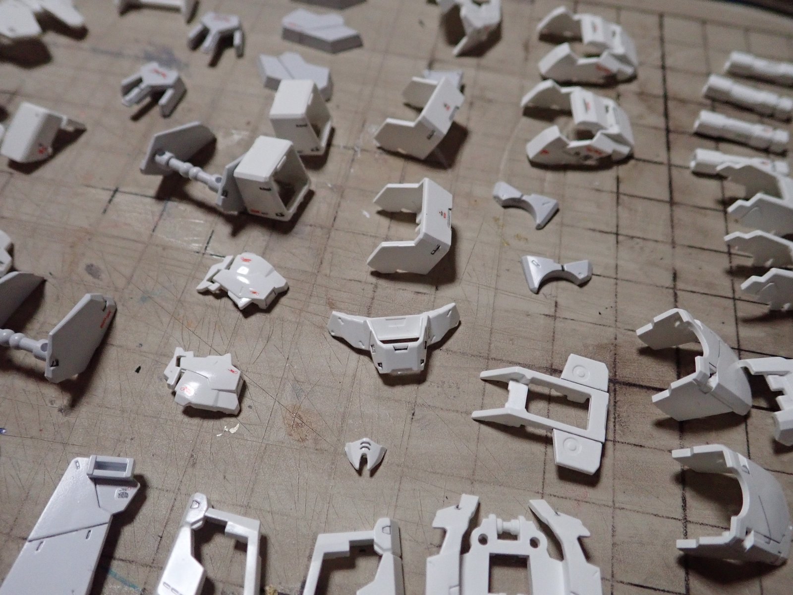 仮組していたので、全部バラしました。固定モデルなので楽勝だと思っていたのですが、腕や足が動かないので外すときに邪魔なんですよね。意外と苦労しました。特に腰のアーマー部分。あと、やけに固い部分もあったりしてバラすのにも時間がかかりました。
